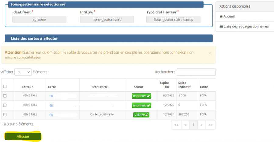 • Consultation de la liste des cartes affectées