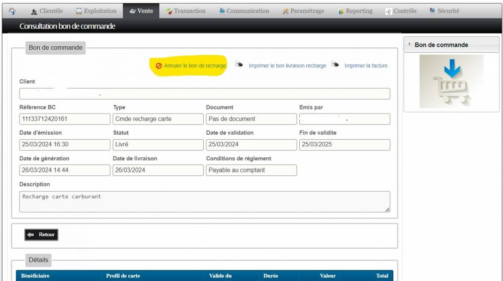 L'annulation des opérations de recharges (classique ou en masse) se fait à partir du bon de commande: