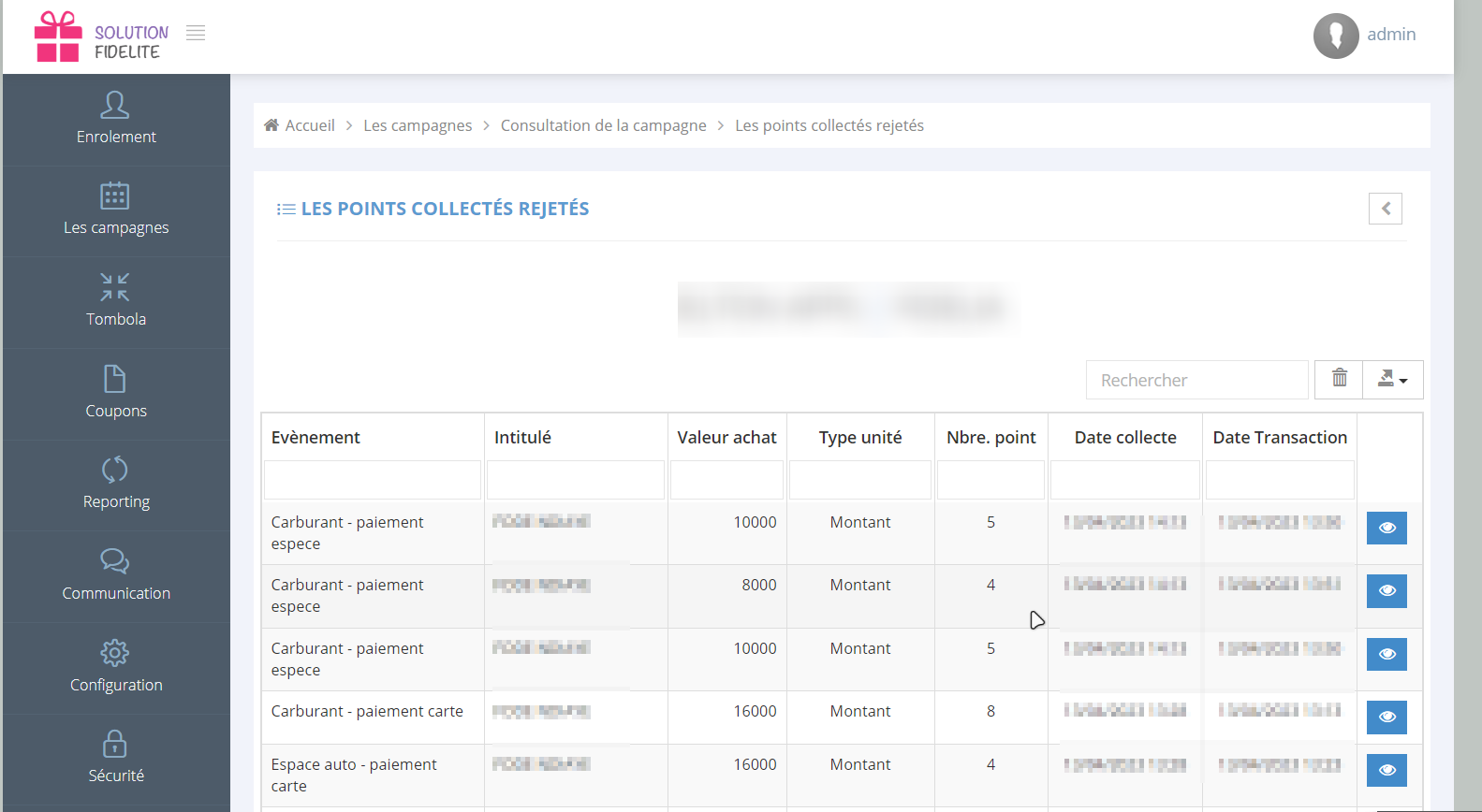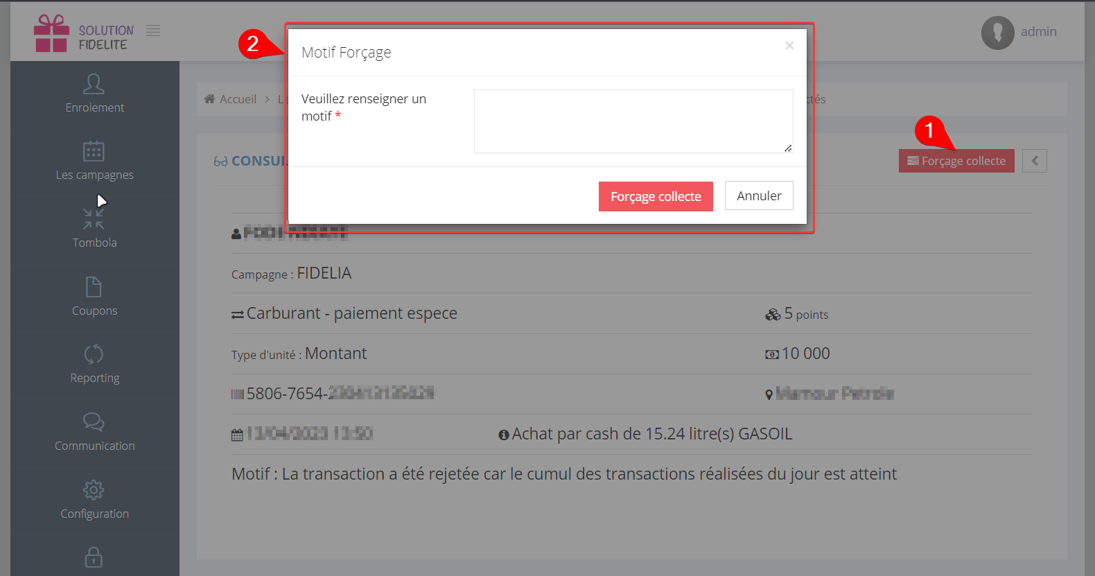 Remarque 2 : Le système de fidélité va rejeter systématiquement tout collecte de point non autorisé et garder l'information au niveau de la page des collectes de points rejetés disponible à partir de Campagne→Collectes rejetées
